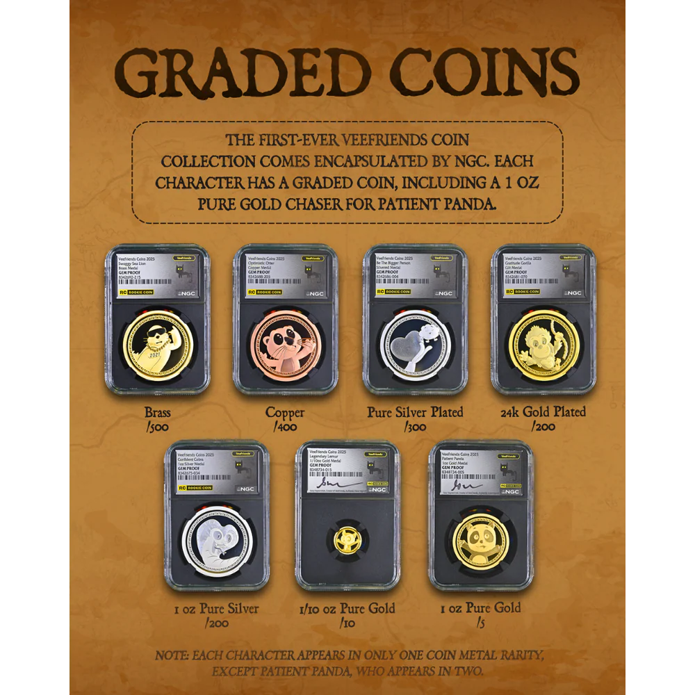 1 Graded Coin – A first-of-its-kind VeeFriends coin, graded and encapsulated by NGC, available in six metal finishes.